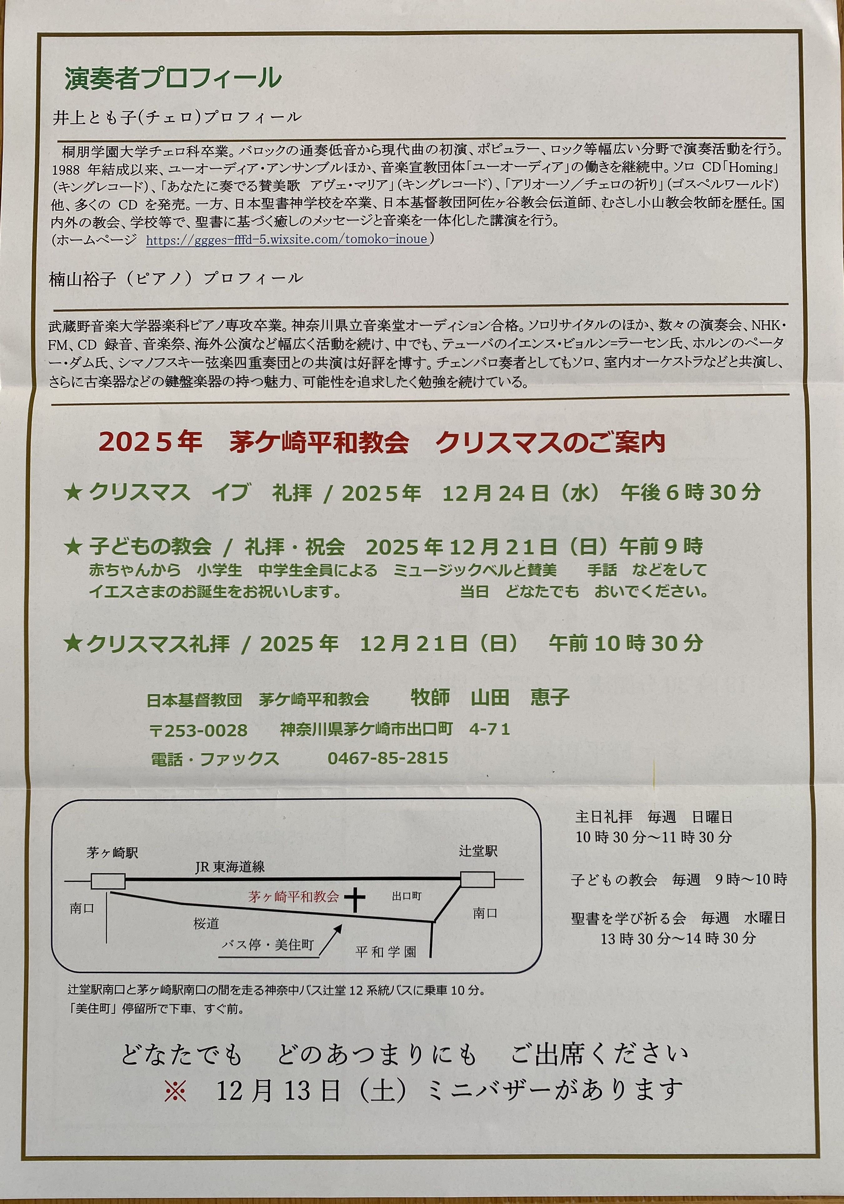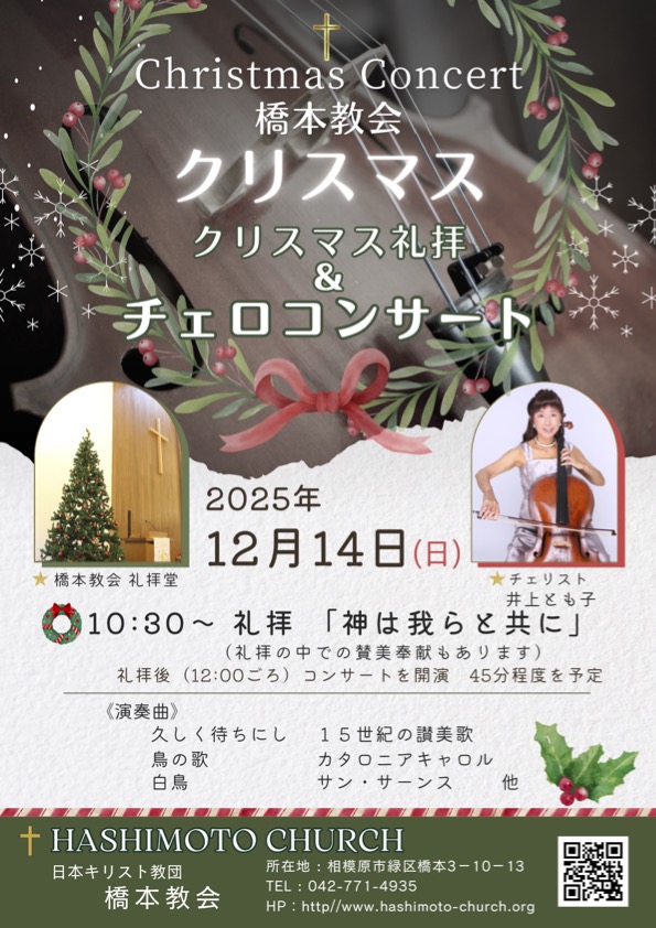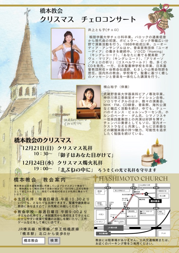 今回、茅ヶ崎の平和教会と、相模原のの橋本教会でチェロとコンサートをさせていただきます。