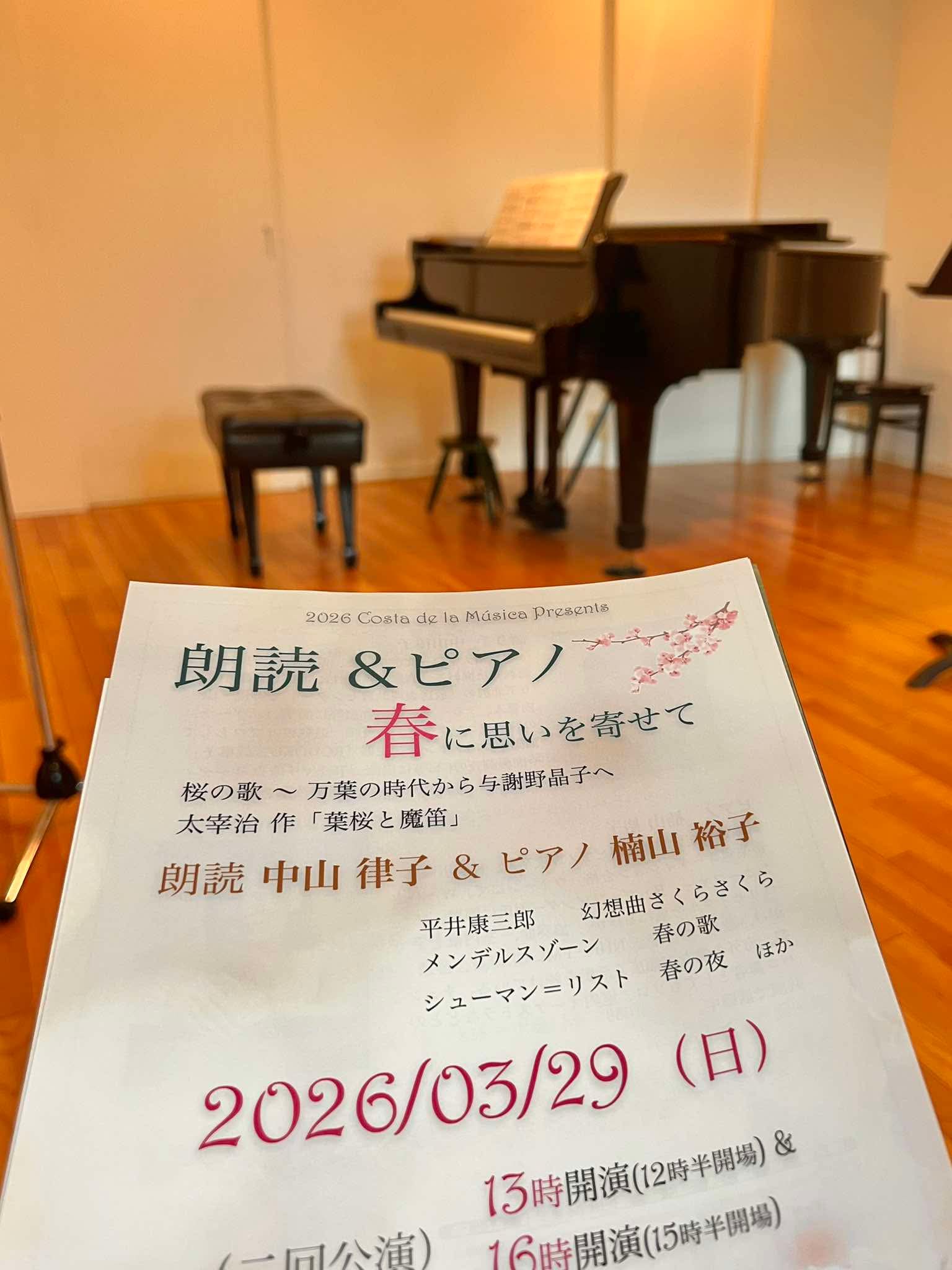 「朗読とピアノ」春の暖かな日差しと、桜の花とともに終了。私達の出し物より?、「桜」が大切だったので、毎日ヤキモキしながら、桜の咲き状況をチェックしていました。七分咲きぐらいだったでしょうか…そんな自然をお客様たちとシェアできたのが嬉しかったです。